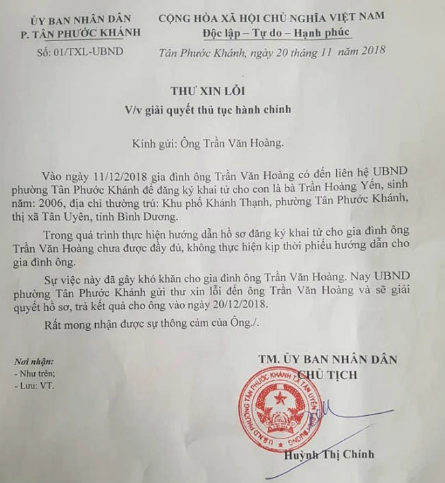 Trả lời Pháp Luật TP.HCM về việc trên, bà Huỳnh Thị Chính, Chủ tịch UBND phường Tân Phước Khánh, cho biết: Cán bộ tư pháp hộ tịch nghiên cứu hồ sơ chưa kỹ đã gây khó khăn cho công dân. Chính quyền đến tận nhà gửi thư xin lỗi và thư chia buồn, đã được gia đình thông cảm chấp nhận lời xin lỗi.