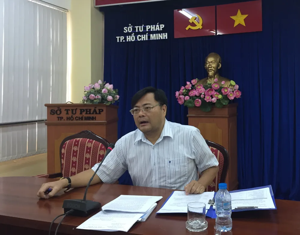 Ông Nguyễn Văn Vũ, Phó Chủ tịch Hội đồng phổ biến, giáo dục pháp luật TP.HCM - Phó Giám đốc Sở Tư pháp TP chủ trì cuộc họp. Ảnh: KP