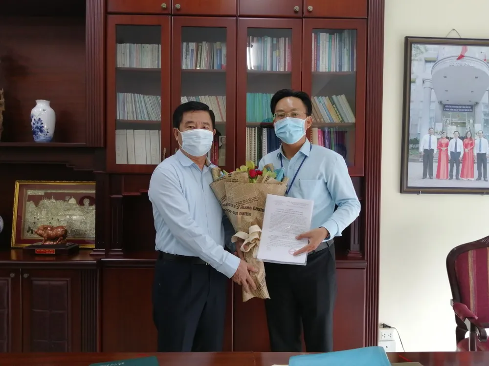 Ông Huỳnh Văn Hạnh (trái), Giám đốc Sở Tư pháp TP.HCM, trao quyết định bổ nhiệm chức vụ Trưởng phòng Bổ trợ tư pháp cho ông Nguyễn Thành Băng. Ảnh: TRÚC PHƯƠNG