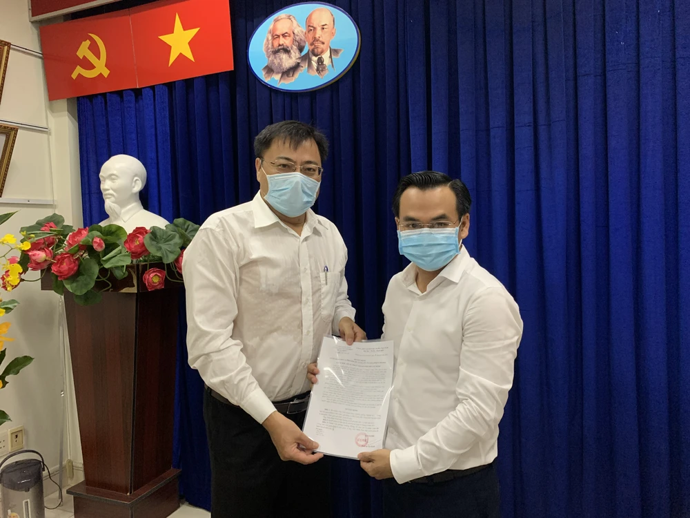 Ông Nguyễn Văn Vũ (trái), Phó Giám đốc Sở Tư Pháp TP.HCM cho quyết định bổ nhiệm cho ông Trần Minh Huệ. Ảnh: TRÚC PHƯƠNG