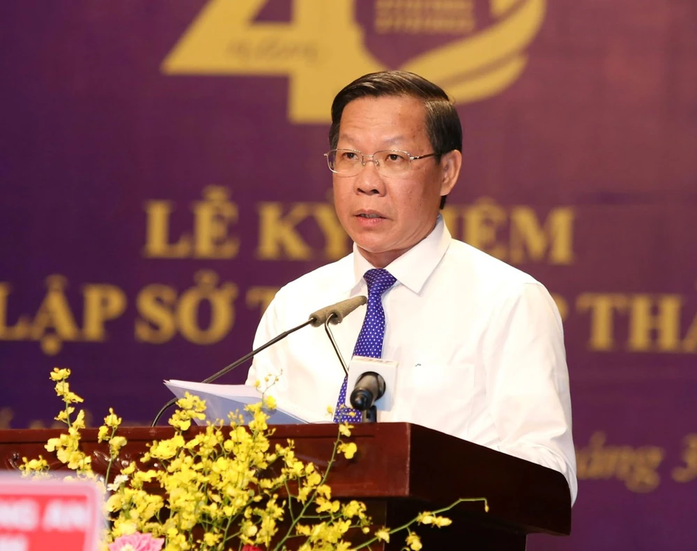 Ông Phan Văn Mãi, Chủ tịch UBND TP.HCM và ông Mai Lương Khôi, Thứ trưởng Bộ Tư pháp, phát biểu tại lễ kỷ niệm 40 năm ngày thành lập Sở Tư pháp TP.HCM. Ảnh: HOÀNG GIANG