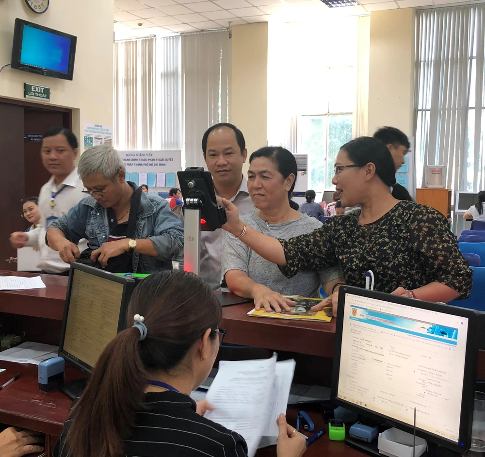Người dân thực hiện đánh giá sự hài lòng về cán bộ Sở Tư pháp TP.HCM. Ảnh: KP