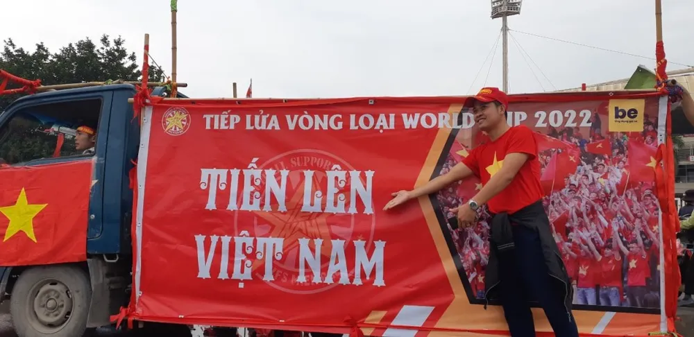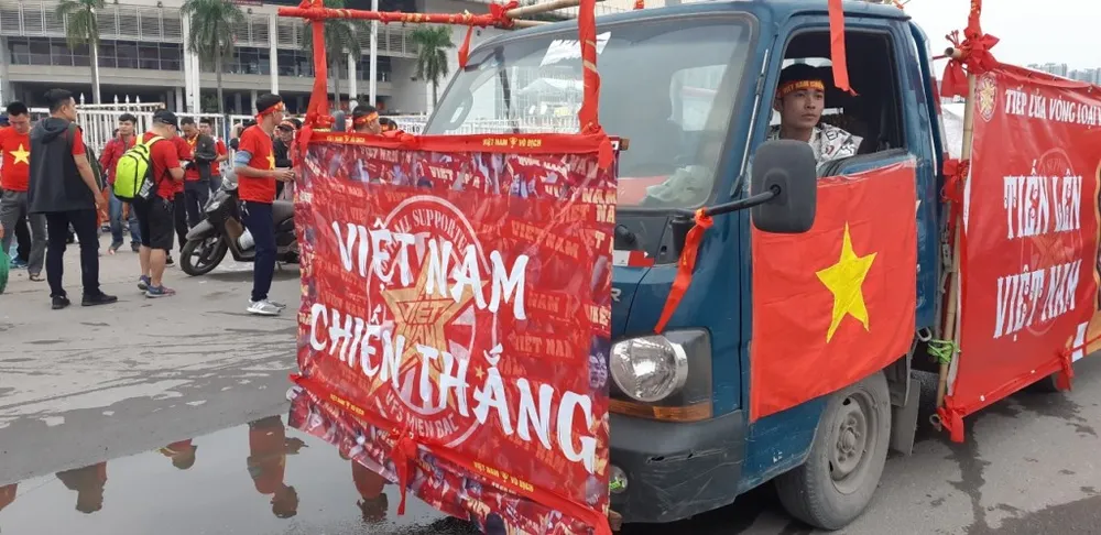 Một nhóm CĐV "chơi lớn" khi trang trí chiếc xe tải đỏ rực các khẩu hiệu cổ vũ tuyển Việt Nam.