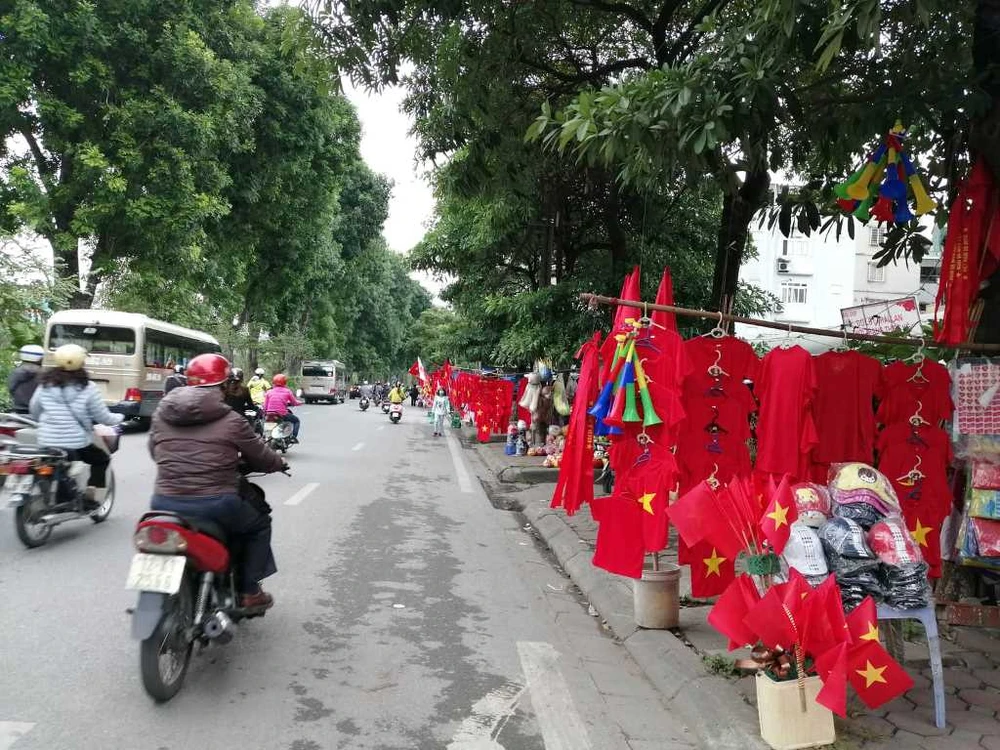 Dọc nhiều tuyến đường hướng về SVĐ Mỹ Đình, cờ, áo và kèn được bày bán ngập tràn.