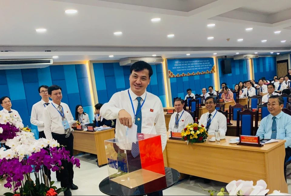 Ông Lê Hòa Bình, Giám đốc Sở Xây dựng bỏ phiếu bầu Ban chấp hành Đảng bộ sở. Ảnh VIỆT HOA