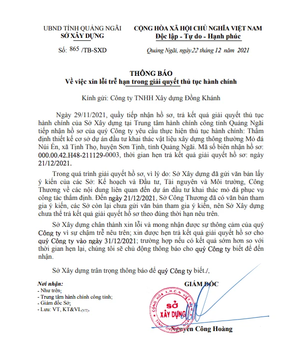 Chiều 25-12, ông Nguyễn Công Hoàng, Giám đốc Sở Xây dựng tỉnh Quảng Ngãi cho biết, Sở vừa có văn bản xin lỗi gửi Công ty TNHH xây dựng Đồng Khánh vì trễ hẹn trong việc giải quyết thủ tục hành chính.