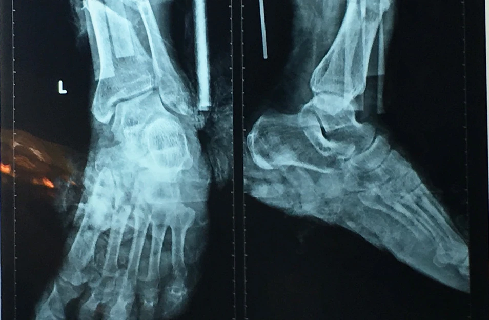 Kết quả chụp X quang cho thấy ông T bị đứt gần lìa 1/3 dưới cẳng chân trái. Ảnh: HÒA KHÁNH