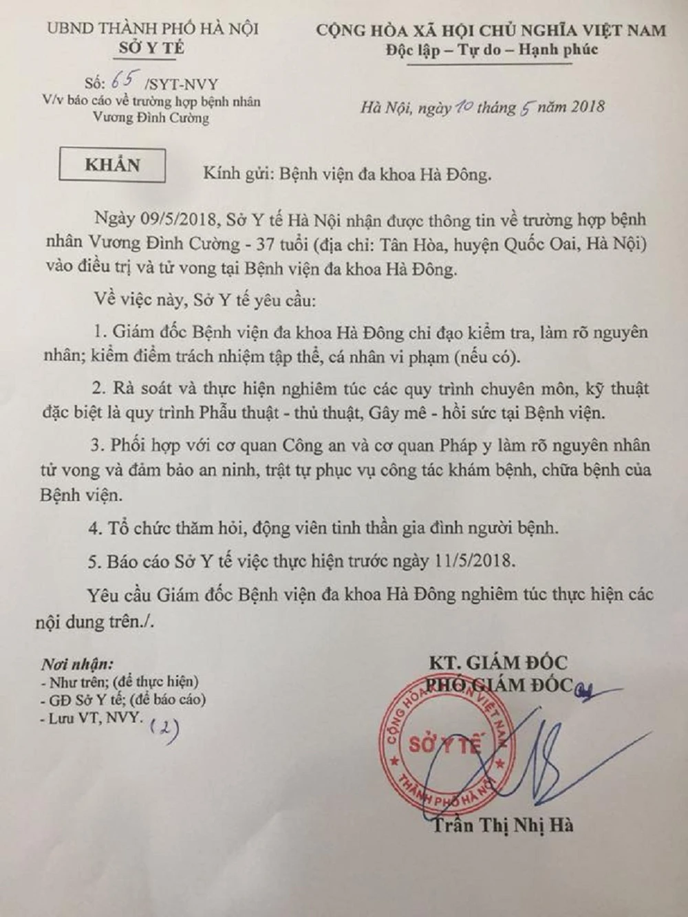 Liên quan đến vụ việc bệnh nhân chết tức tưởi sau khi bác sĩ thông báo phẫu thuật thành công, sáng 10-5, Sở Y tế TP Hà Nội cho biết: Tối 9-5, sau khi nhận được thông tin về trường hợp bênh nhân Vương Đình Cường (31 tuổi, ngụ tại Tân Hòa, huyện Quốc Oai, Hà Nội) vào điều trị và tử vong tại Bệnh viện (BV) đa khoa Hà Đông, lãnh đạo Sở đã có chỉ đạo ban đầu.