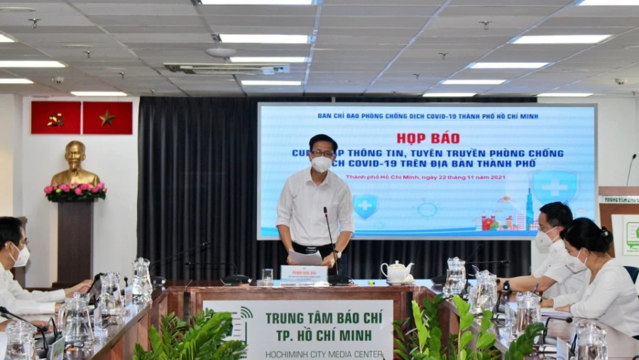 Ông Phạm Đức Hải, Phó trưởng Ban Chỉ đạo phòng chống dịch COVID-19 TP.HCM thông tin tại họp báo. Ảnh: TÁ LÂM