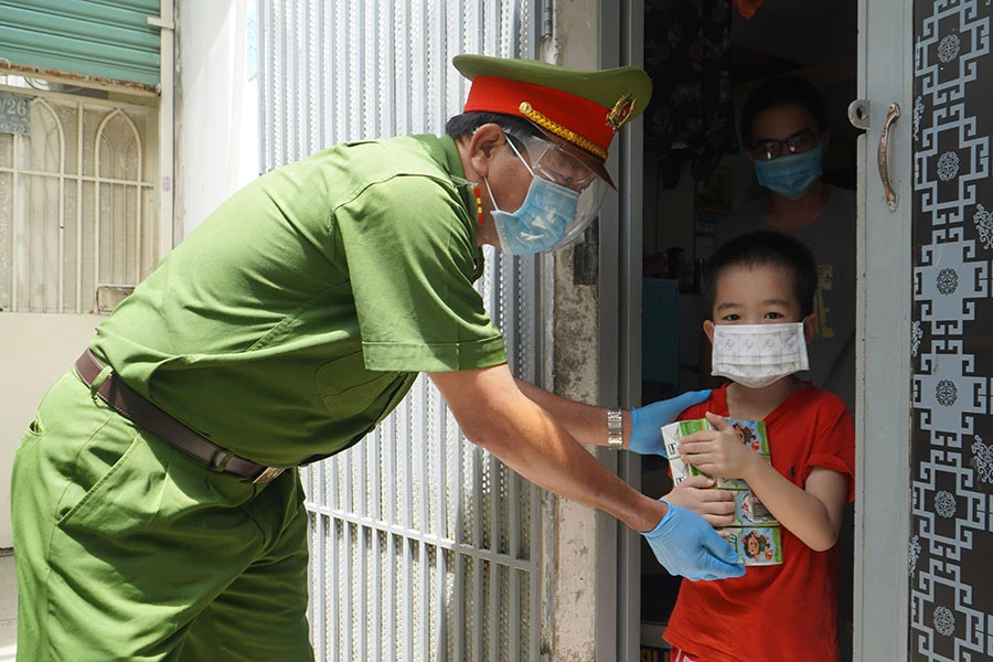 Công an phường 5, quận Phú Nhuận, TP.HCM đi trao quà cho người dân trong địa bàn. Ảnh: MINH TÂM