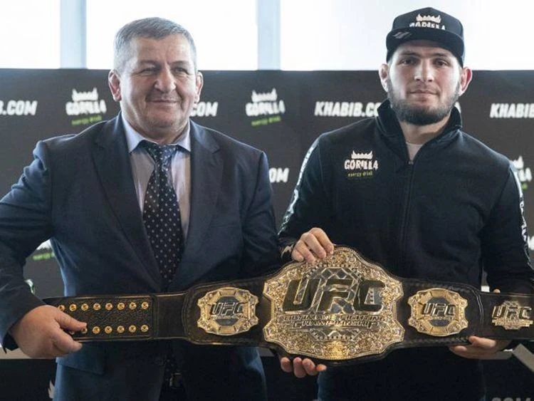 Bố con nhà Khabib với chiếc đai vô địch UFC.