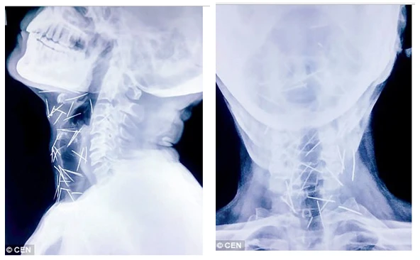 Ảnh chụp X-quang cho thấy kim nằm trong cổ bệnh nhân. Ảnh: DAILY MAIL