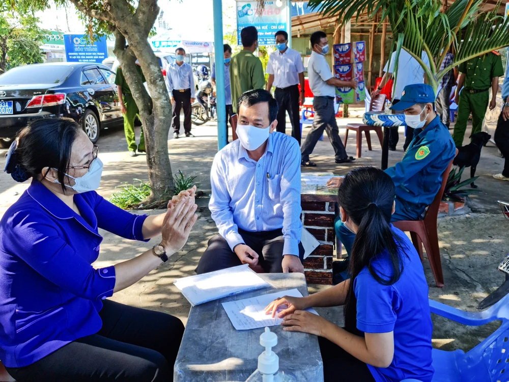 Bà Huỳnh Thị Diễm Ngọc (bìa trái), Phó chủ tịch UBND tỉnh Sóc Trăng trong một lần kiểm tra công tác phòng, chống dịch COVID-19 tại thị xã Vĩnh Châu. Ảnh: DIỄM HẰNG