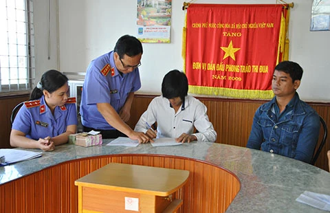 Anh Trần Văn Đở và Khâu Sóc đang làm thủ tục nhận tiền bồi thường tại VKSND tỉnh Sóc Trăng sáng 14-1. Ảnh: T.VŨ