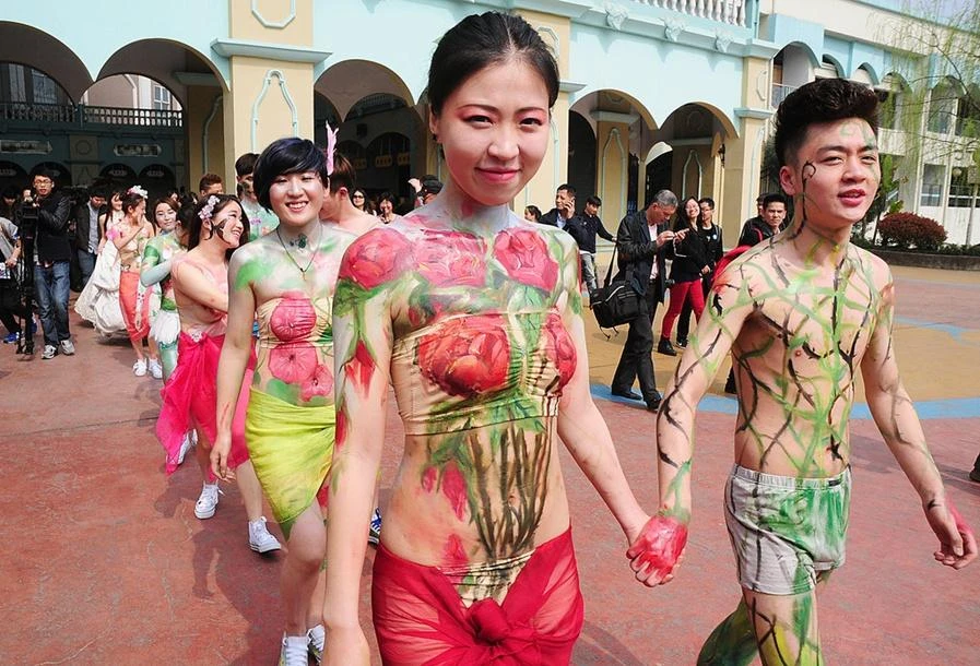 Theo trang tin tức China Daily (Trung Quốc), 10 cặp cô dâu chú rể hôm 22-3 đã làm lễ cưới khi chỉ mặc vỏn vẹn đồ lót, còn thân thể thì được che lấp bằng cách sơn vẽ nhiều họa tiết khác nhau.