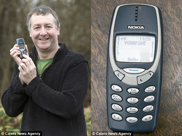 Cựu binh Dave Mitchell và chiếc điện thoại Nokia 3310 mua từ năm 2000 của mình. Ảnh: DAILYMAIL