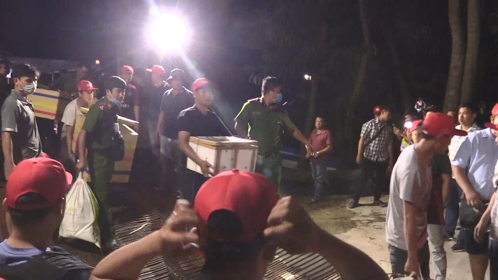 Lực lượng công an đưa tang vật thu giữ tại sới bạc từ trên thuyền vào bờ. Ảnh: Công an cung cấp