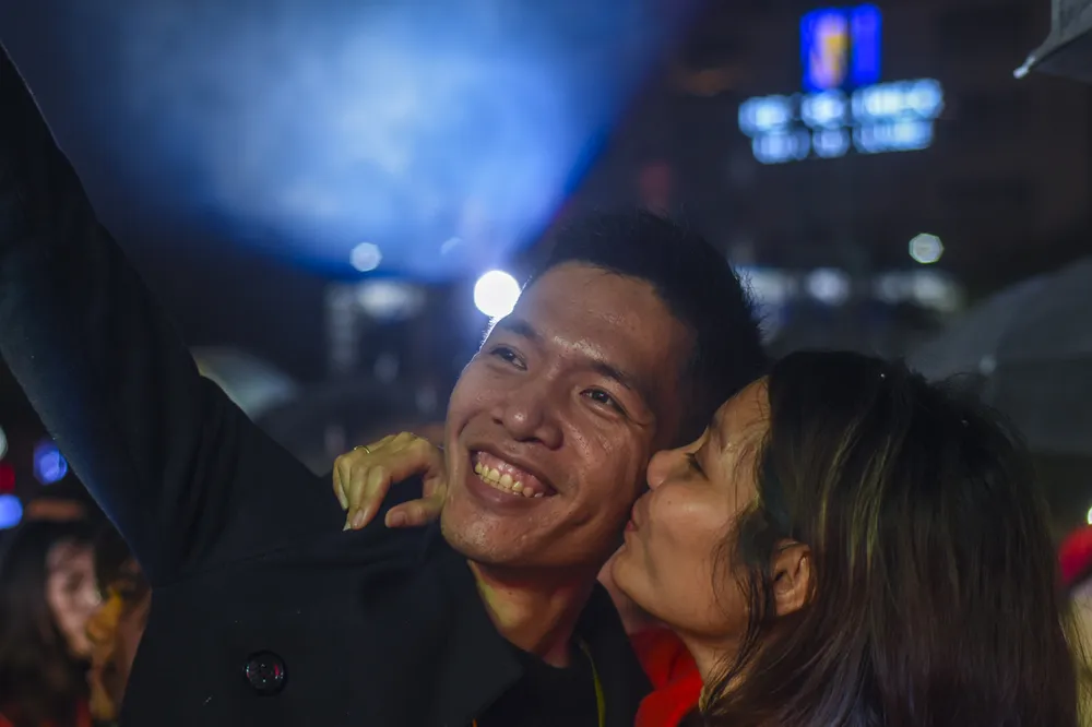 Họ trao cho nhau nụ hôn hạnh phúc vào những giây đầu tiên của năm mới. Ảnh: NGUYỄN DO
