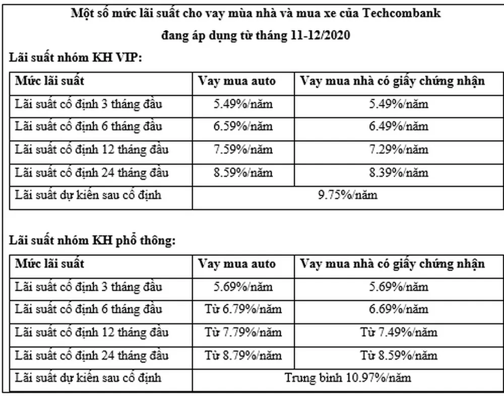 Cạnh đó Techcombank cũng đã áp dụng mức lãi suất áp dụng cho khách sau thời gian cố định lãi suất ở mức từ 9,3-9,8% dành cho khách hàng VIP và khoảng 10,7-11,2% cho khách hàng thông thường. Đây là những mức lãi suất rất hấp dẫn trên thị trường hiện nay khi cho vay mua nhà và ô tô.