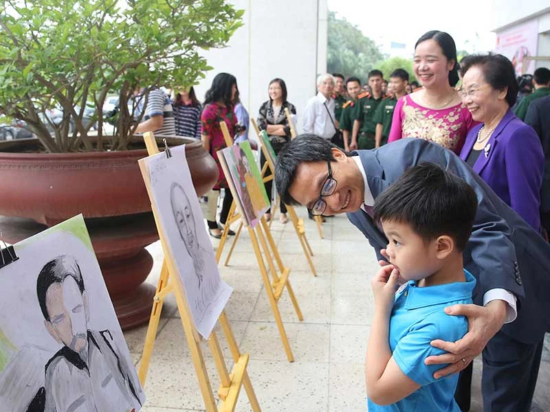 Phó Thủ tướng Vũ Đức Đam hỏi chuyện một em bé đang xem bức tranh Chủ tịch Hồ Chí Minh do các em vẽ tại ngày hội. Ảnh: plo.vn