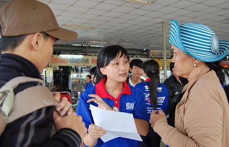 Một tình nguyện viên đang tư vấn cho thí sinh và phụ huynh từ Ninh Thuận tại Bến xe Miền Đông. Ảnh: H.VY