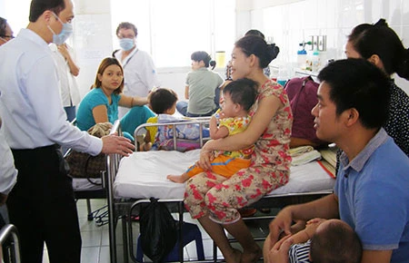 Thứ trưởng Bộ Y tế Lê Quang Cường (bìa trái) thăm hỏi các trẻ bệnh sởi đang điều trị tại BV Nhi đồng 1. Ảnh: TR.NGỌC