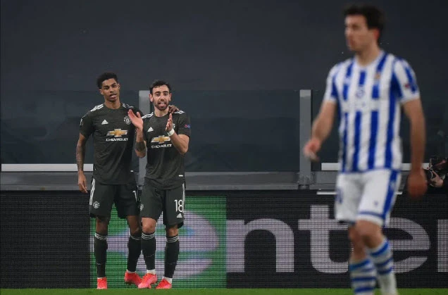 Bruno Fernandes và Marcus Rashford đều ghi bàn trong chiến thắng 4-0 của MU trước Real Sociedad. ẢNH: AFP