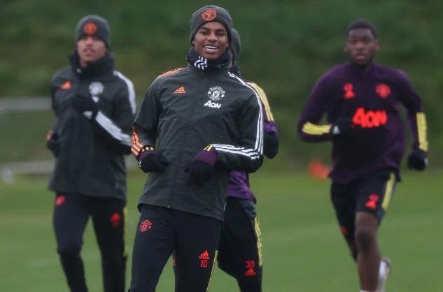 Rashford tươi cười trong buổi tập của MU. ẢNH: GETTY IMAGES