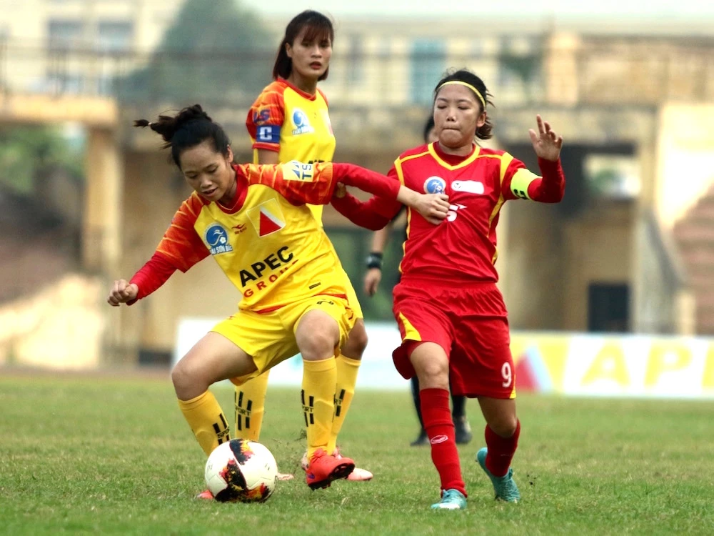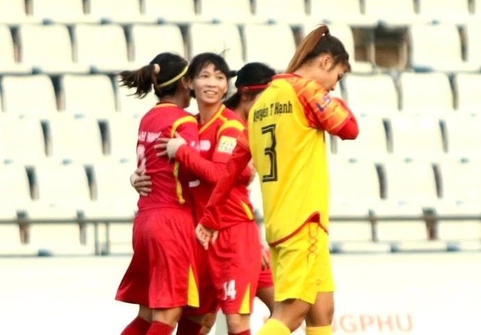 Tiền đạo Huỳnh Như (9) mở tỉ số trong chiến thắng 3-0 của TP.HCM I trước Sơn La. ẢNH: CMQ