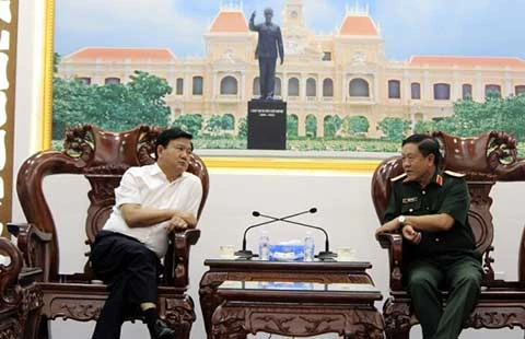 Ông Đinh La Thăng gặp gỡ, trao đổi với lãnh đạo Đảng ủy Quân sự TP.HCM. Ảnh: Báo GIAO THÔNG