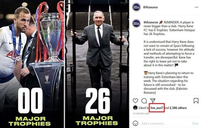 Sau vài giờ đăng tải, bài viết thu về hàng ngàn bình luận gay gắt hướng về số 10, trong vô vàn lượt tương tác người ta dễ dàng nhận ra Son Heung-Min cũng đã “like” dòng trạng thái này. Hành động này cho thấy ngôi sao châu Á cũng bất bình với cách mà Harry Kane đối xử với đội bóng. Báo giới Anh vẫn nhanh tay chụp lại bằng chứng bài viết gây sốt này.