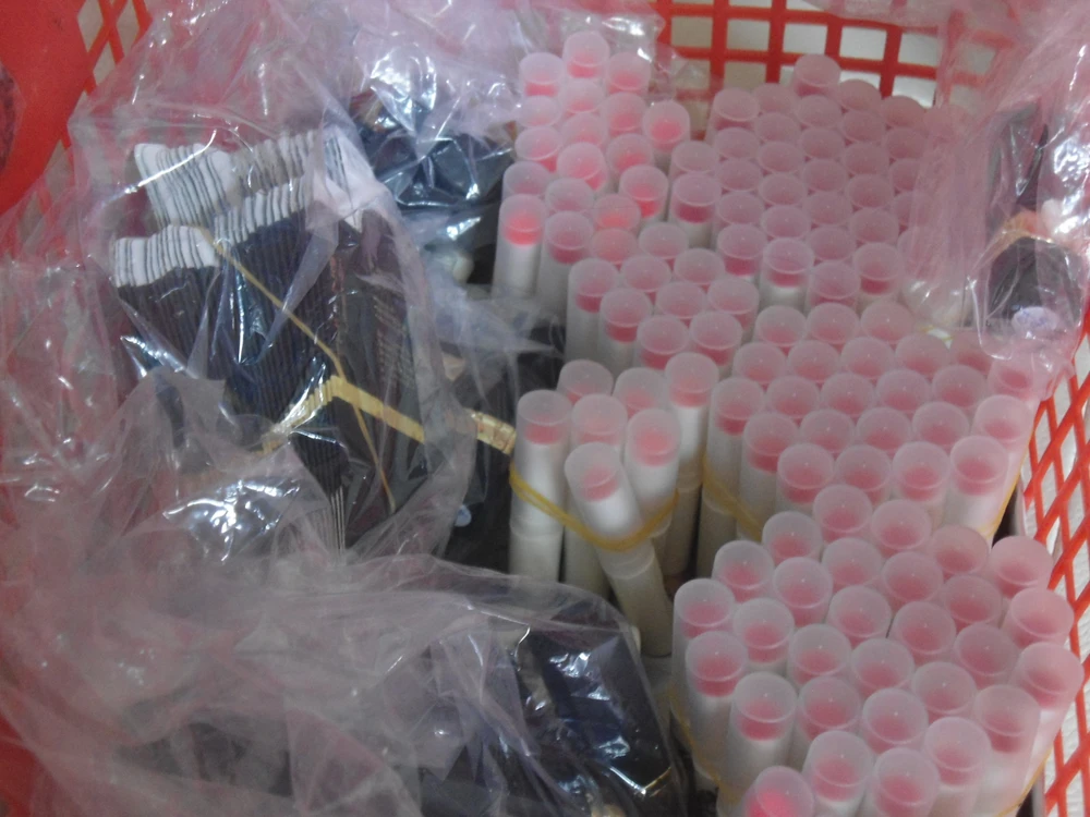 Tiếp tục liên hệ với một địa điểm bán son tự chế khác trên đường Lê Lư, phường Phú Thọ Hòa, quận Tân Phú, bạn Huỳnh Phương Uyên cho chúng tôi xem các loại son handmade mình đang kinh doanh, với đủ các thể loại son không màu, son sáp có màu, son sáp cao cấp... được đựng trong một giỏ nhựa. Giá các loại son này dao động từ 15.000 đồng đến 160.000 đồng/cây.