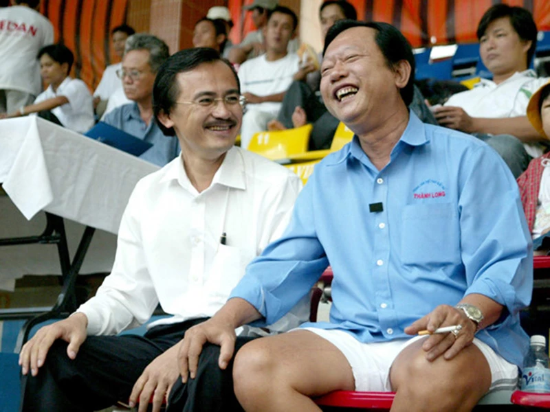 Bầu Hưng (phải) và bầu Thắng, hai trong số ít những ông bầu làm bóng đá tử tế, không tham, không giành ghế mà chỉ vì tình yêu và niềm vui. Ảnh: Tư liệu