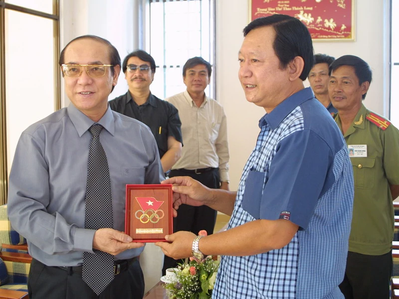 Bầu Hưng (phải) nhận huy hiệu Olympic từ Bộ trưởng Nguyễn Danh Thái. Ảnh: XUÂN HUY