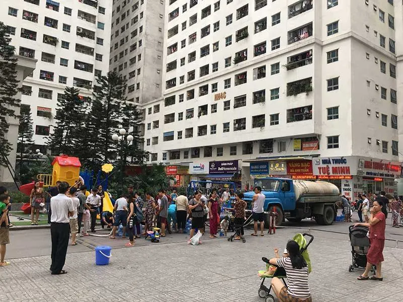 Người dân khu chung cư HH Linh Đàm (Hoàng Mai, Hà Nội) xếp hàng lấy nước sạch từ xe téc. Ảnh: CTV