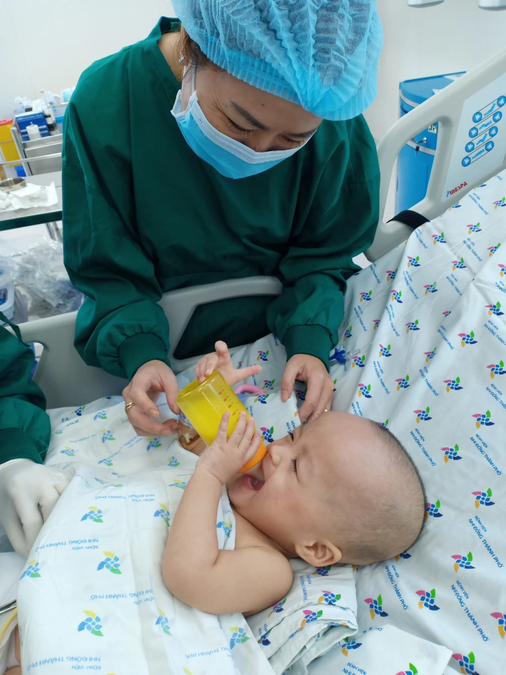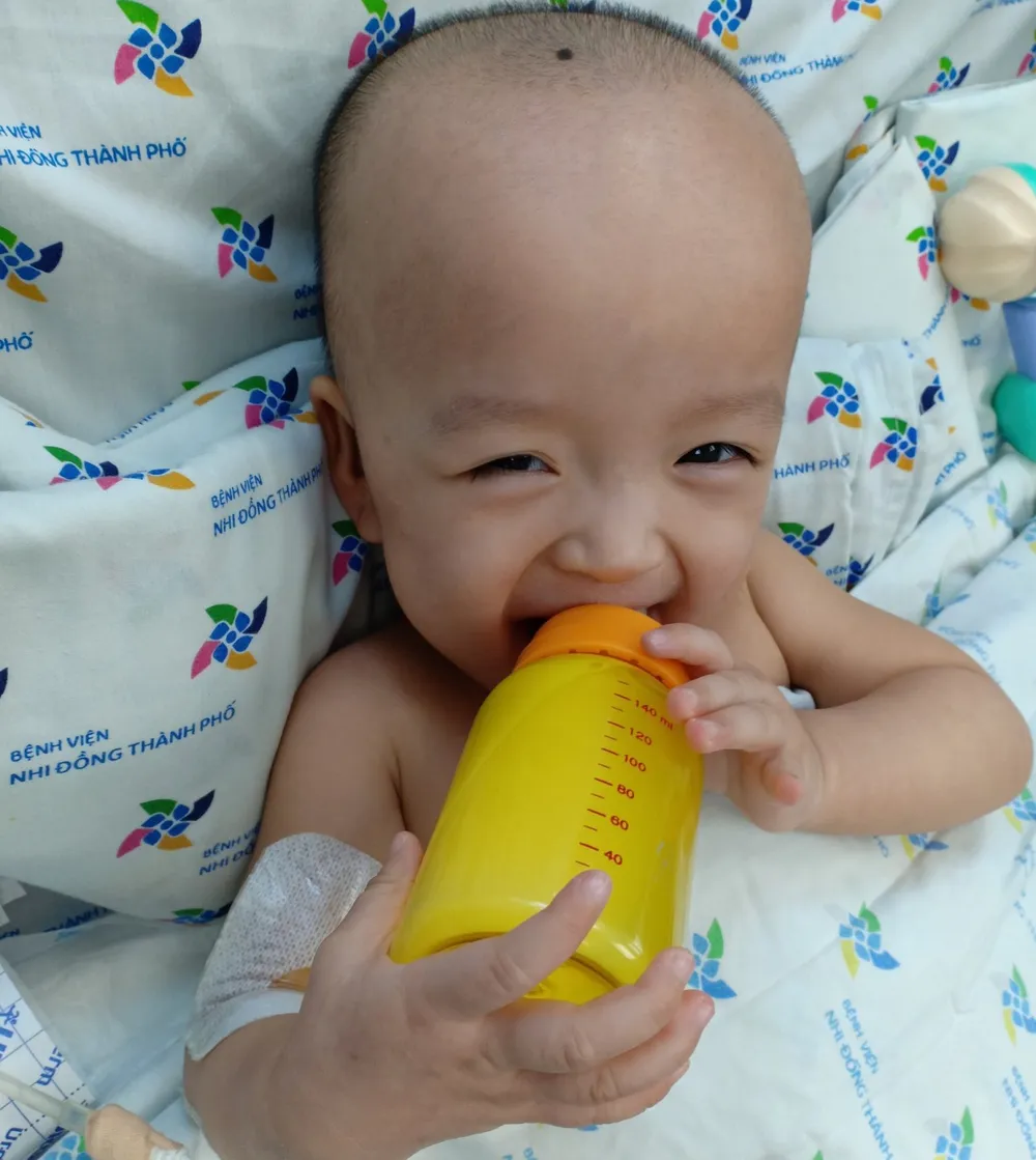 Diệu Nhi uống được nhiều sữa và rất vui khi ba mẹ vào thăm. Ảnh: BVNĐ