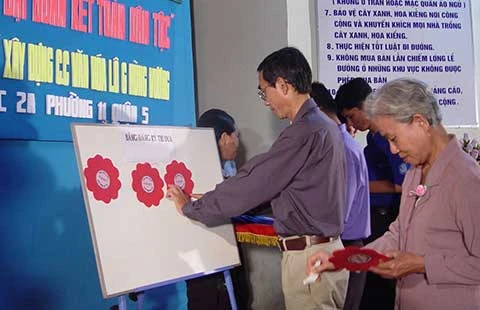 Các hộ dân tại khu chung cư Hùng Vương, phường 11, quận 5, TP.HCM trong một lần đăng ký thi đua khu chung cư văn hóa. Ảnh: HTD