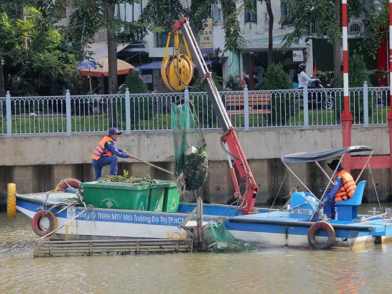 Công nhân vớt rác trên kênh Nhiêu Lộc-Thị Nghè. Ảnh: HOÀNG GIANG