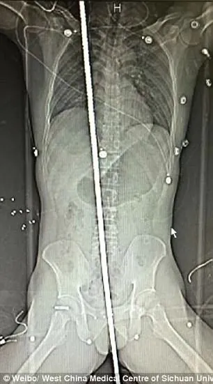 Hình chụp X-Quang bệnh nhân (trái) và thanh kim loại được lấy ra khỏi người nạn nhân sau ca phẫu thuật. Ảnh: Weibo