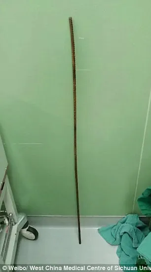 Anh này lập tức được chuyển vào bệnh viện tỉnh Tứ Xuyên cùng với thanh sắt dài trong cơ thể. Sau 7 giờ tiến hành phẫu thuật, các bác sĩ đã lấy thanh sắt ra khỏi cơ thể bệnh nhân thành công. Ước tính, thanh sắt đó dài 6,6 feet (tương đương 2m).