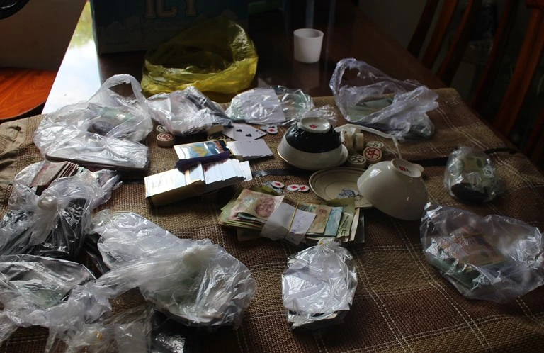 "Công an đã thu 2 bộ chén dĩa, 16 con vị và bộ bài 52 lá, 10 xe máy, hơn 300 triệu đồng, 30 điện thoại di động” Thượng tá Phạm Việt Tiến, Trưởng phòng PC45 nói.