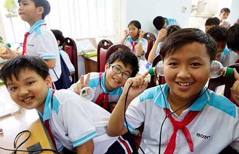 Các em học sinh thú vị với sản phẩm tai nghe do chính mình thực hiện.