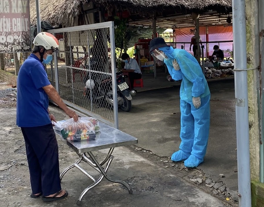 Tình nguyện viên trao quà cứu trợ cho người dân khó khăn tại TP.HCM. Ảnh: CTV