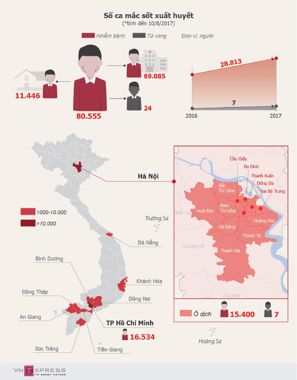 Sốt xuất huyết có ở hầu hết tỉnh/thành, TP.HCM có bệnh nhân nhiều nhất, Đà Nẵng nhiều người nhập viện nhất và Hà Nội tốc độ lan nhanh nhất.