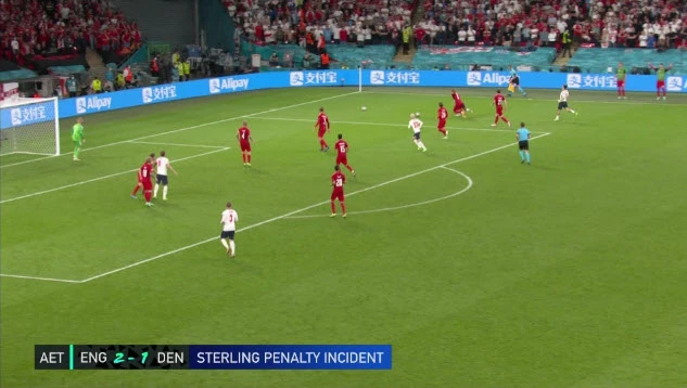 Ở phút cuối hiệp phụ đầu tiên, Sterling ngã trong vòng cấm sau pha đeo bám của hai cầu thủ Đan Mạch. Trọng tài chỉ tay vào chấm 11m trong sự phản đối của cầu thủ Đan Mạch. Sau khi nghe tổ VAR tư vấn, trọng tài không thay đổi quyết định. Harry Kane cần đến 2 cú sút mới có thể hạ gục thủ môn Kasper Schmeichel ghi bàn quyết định cho Anh.
