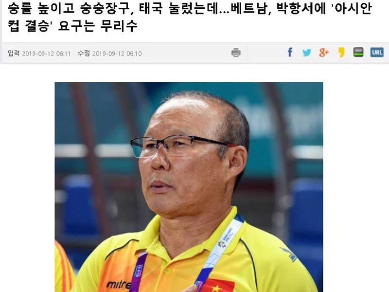 Ngày 15-9, tờ báo của Hàn Quốc dùng từ “vô lý” để nói về các điều khoản hợp đồng của VFF sẽ tái ký với HLV Park Hang-seo là đưa tuyển Việt Nam vào chung kết Asian Cup 2023. Theo đó, Sports Seoul còn ví von đội mạnh như Hàn Quốc, nhà vô địch của châu Á, cũng chỉ mới có một lần vào chung kết sau bảy giải đấu gần nhất.