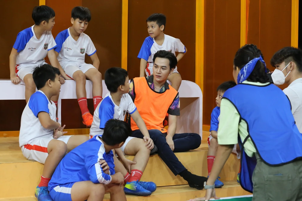 Đứng bên cạnh Ali Hoàng Dương, Mâu Thuỷ cũng diễn nét mặt nghiêm trọng rồi nói đùa rằng: “Thôi kệ kệ. Ngay cả các cầu thủ nhí cũng phải tuân thủ mặc đồng phục bóng đá nữa mà. Thì tại sao lại có một người không mặc”.