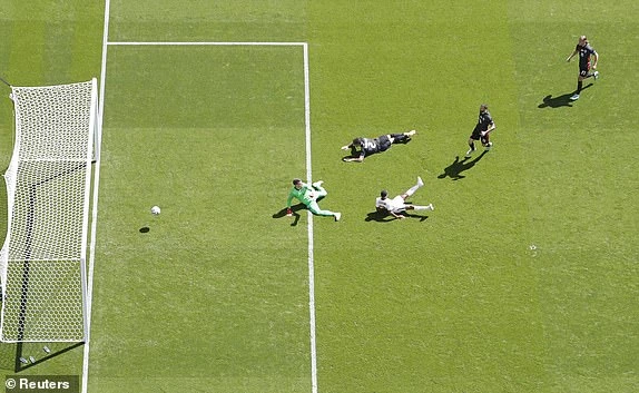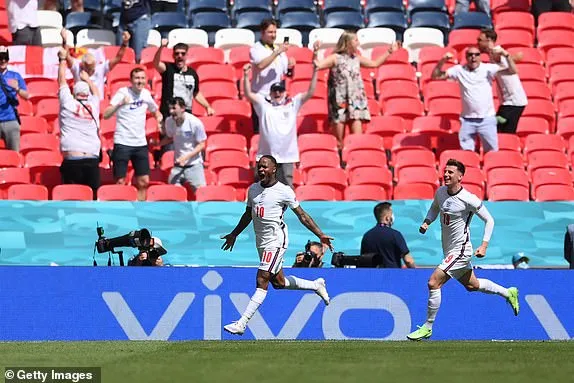 Phút 57, từ đợt tấn công tưởng như vô hại ở khu vực giữa sân, bóng được chuyển thẳng lên cho Kalvin Phillips. Phillips tung đường kiến tạo cho Sterling thoát xuống dứt điểm một chạm vào lưới mở tỉ số 1-0 cho tuyển Anh.