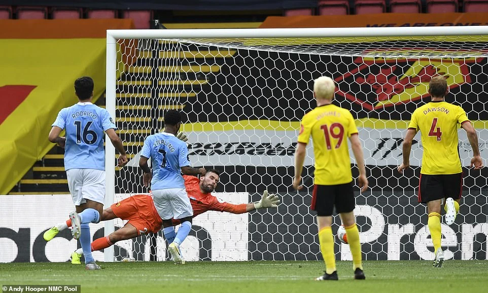Sang hiệp hai Man. City tiếp tục lối chơi tấn công áp đảo và điểm sáng trên hàng công của “Man Xanh” vẫn là tiền đạo Sterling. Nhận đường chuyền của Kevin De Bruyne, Sterling tự tin tung cú sút xa ngoài vòng cấm nhưng không thể thắng được thủ môn của Watford.
