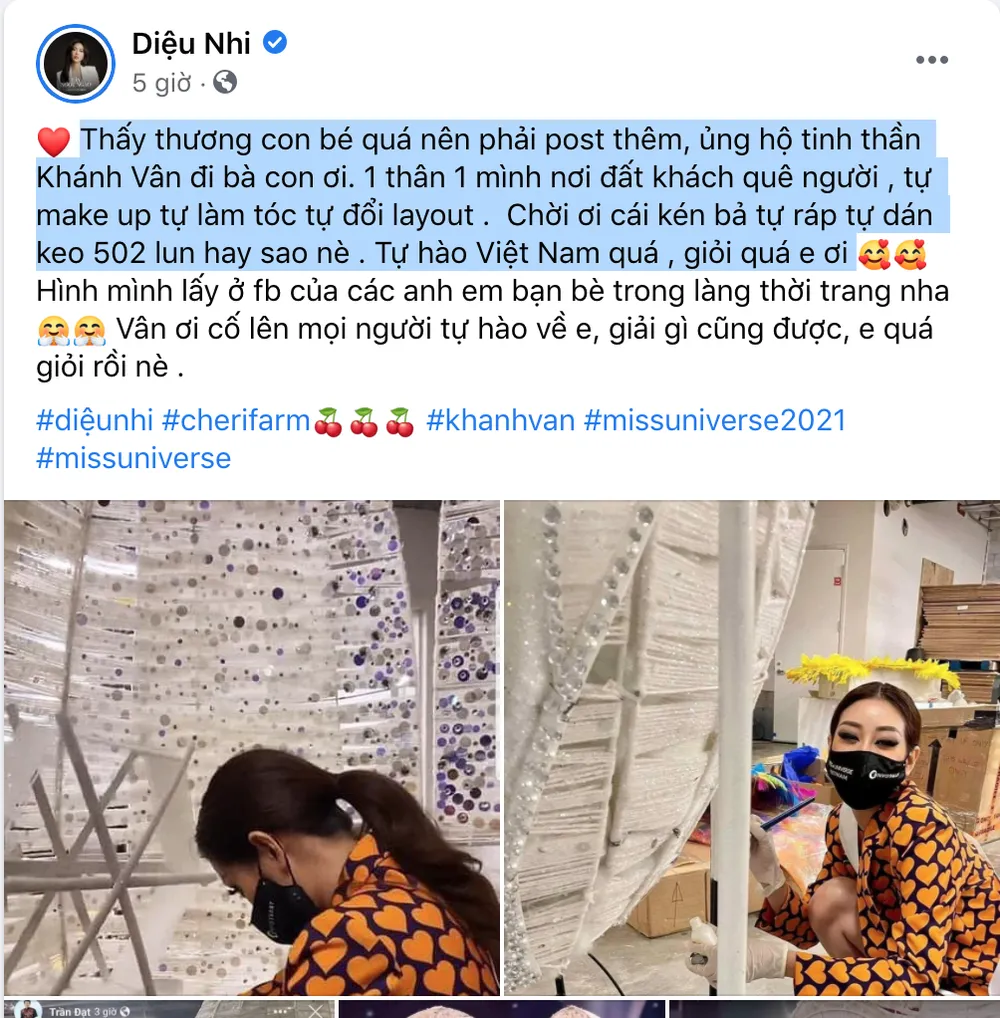 Chia sẻ lại những hình ảnh của Khánh Vân, Diệu Nhi viết trên trang cá nhân của mình rằng: “Thấy thương con bé quá nên phải post thêm, ủng hộ tinh thần Khánh Vân đi bà con ơi. Một thân một mình nơi đất khách quê người, tự make up, tự làm tóc, tự đổi layout. Chời ơi cái kén bả tự ráp tự dán keo 502 lun hay sao nè. Tự hào Việt Nam quá, giỏi quá em ơi!”. Nguyễn Kiều Cẩm Thơ ngắn gọn: “Thương em Kén Em. Cố lên nhé cô gái!”.
